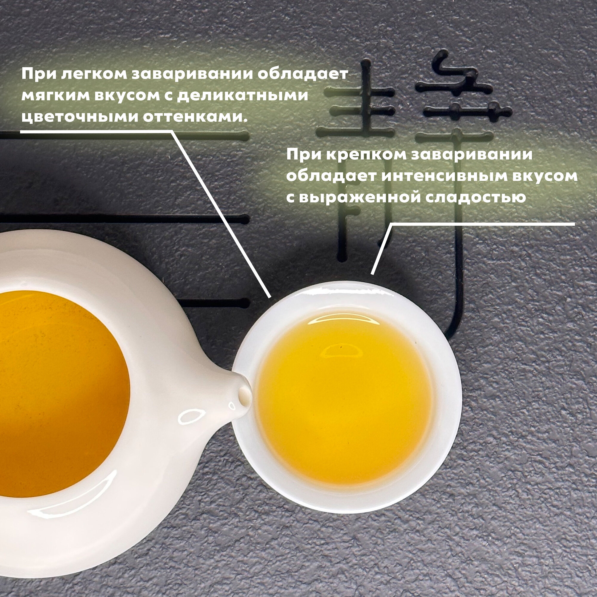 - Используются только натуральные сорта чая. Те Гуанинь(улун, зеленый), Билочунь(зеленый) , Сяоджун (черный чай) без консервантов, отдушек и красителей
